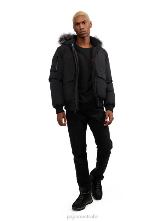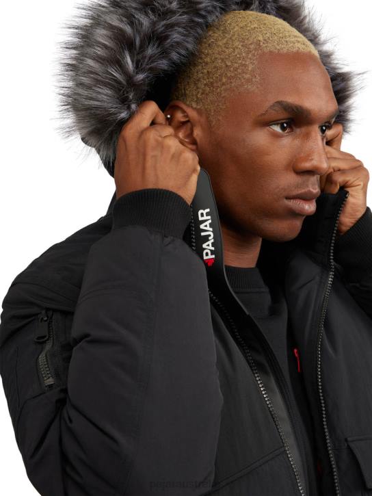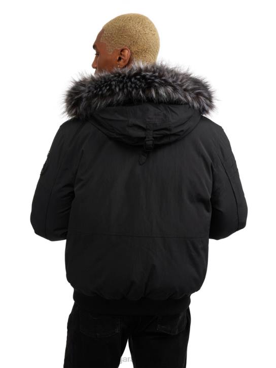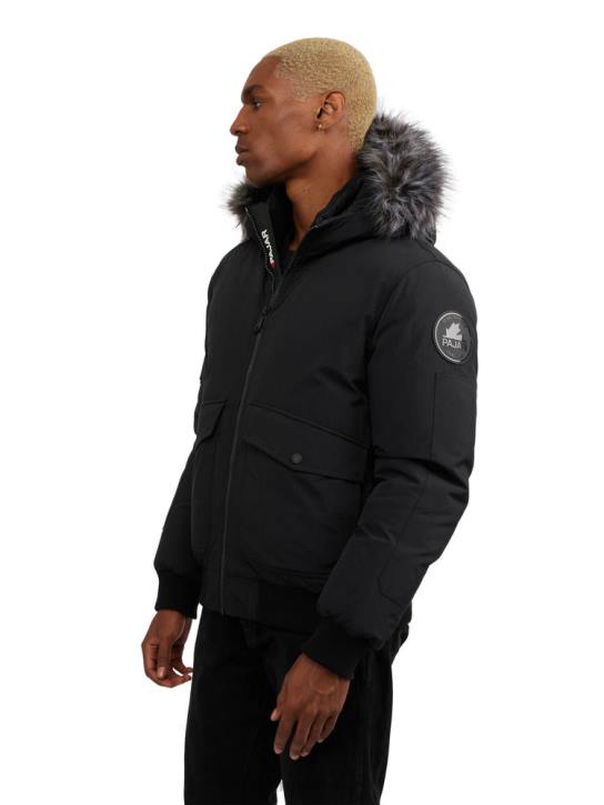 Men's mixed-media zip front bomber with fixed hood & removable faux fur trim. Equipped with large bottom double-entry patch pockets. Sleeve pocket for extra storage. Cozy rib knit inner collar, cuffs and waistband. Adjustable hood tab.*