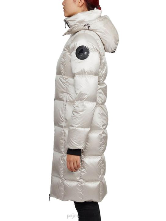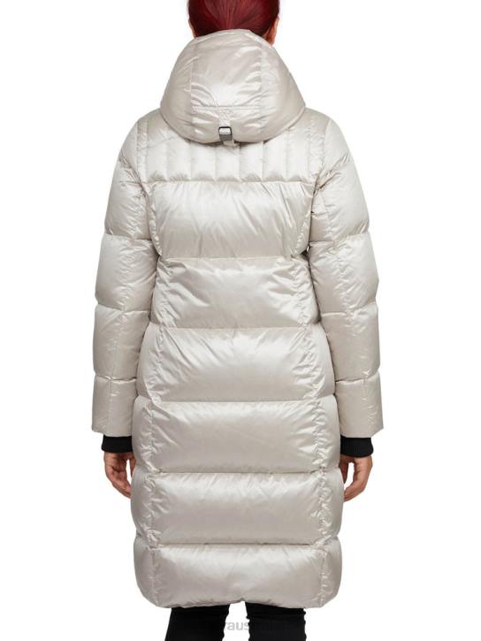 Women's Long channel quilted puffer with concealed belt @ back. Removable hood. Equipped with exposed front zipper & bottom pockets. Cozy rib knit storm cuffs.*