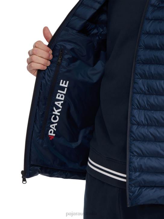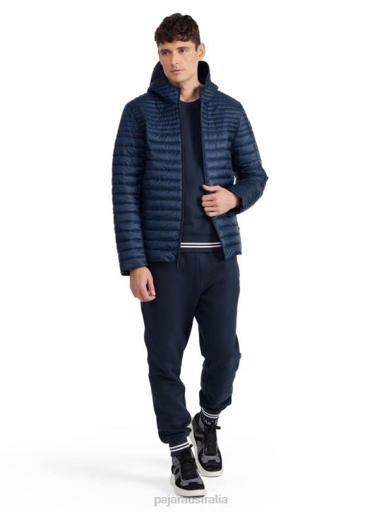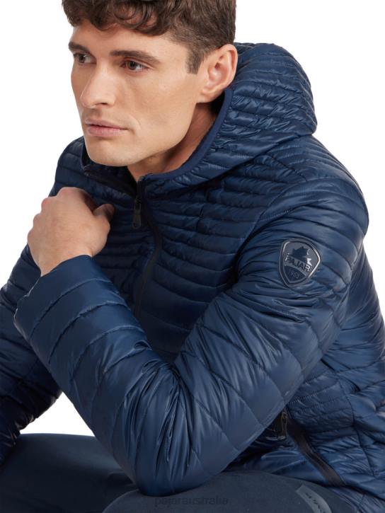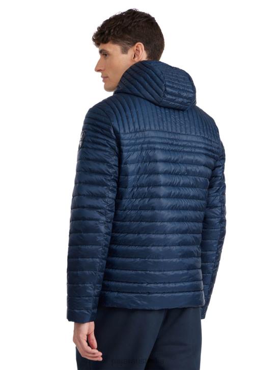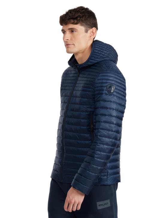 Men's channel quilted lightweight packable downfill zip front jacket. Equipped with zipper double-length pockets. Fixed hood.