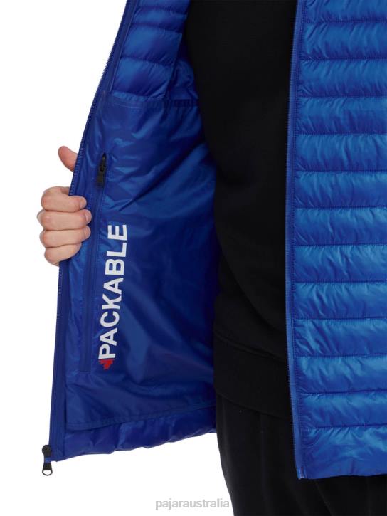 Men's channel quilted lightweight packable downfill zip front jacket. Equipped with zipper double-length pockets. Fixed hood.