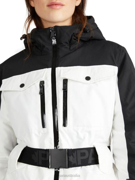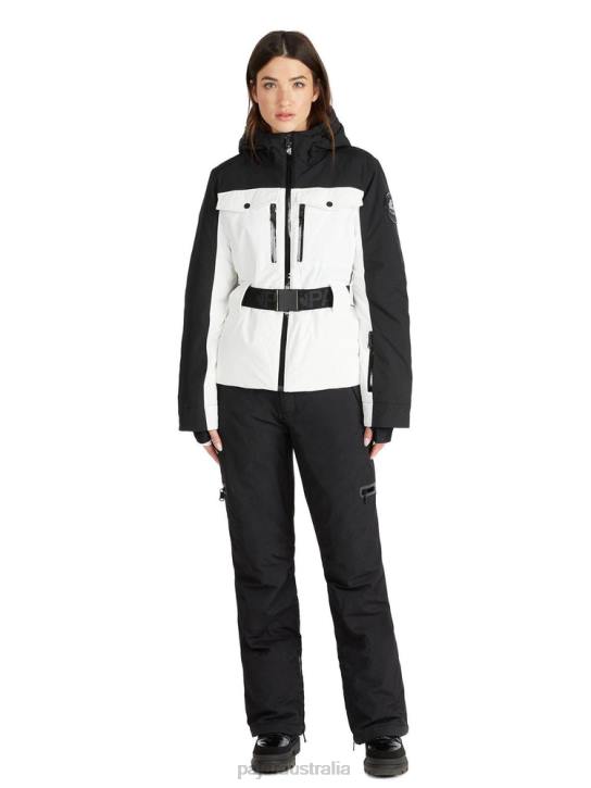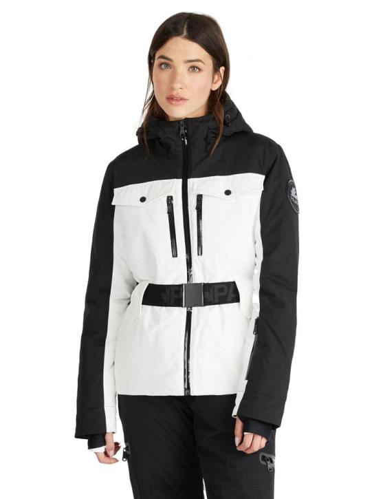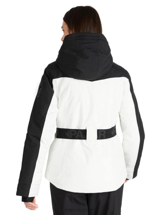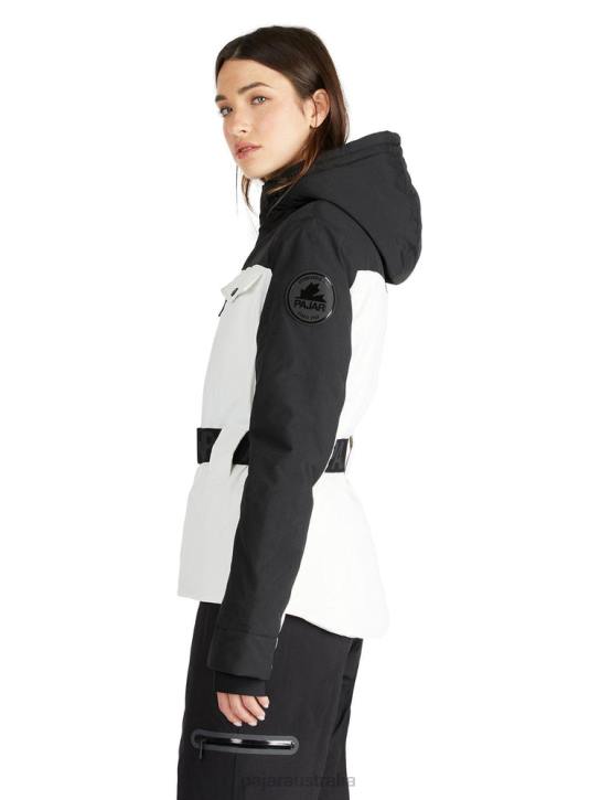 Women's belted mix-media ski jacket with fixed hood. Contrast shell color detail. Equipped with exposed zip front closure, snap flap chest and zipper pockets. *