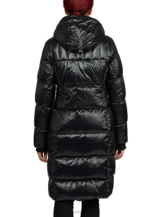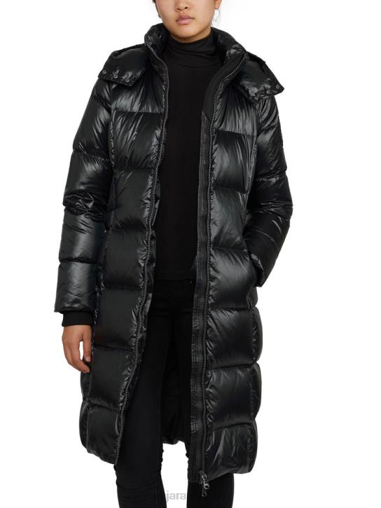 Women's Long channel quilted puffer with concealed belt @ back. Removable hood. Equipped with exposed front zipper & bottom pockets. Cozy rib knit storm cuffs.*
