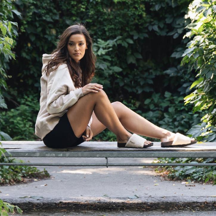 Slide on Sandal Vegan Faux Fur Shearling Style runs in whole sizes only; size up to find your perfect fit Spot clean only