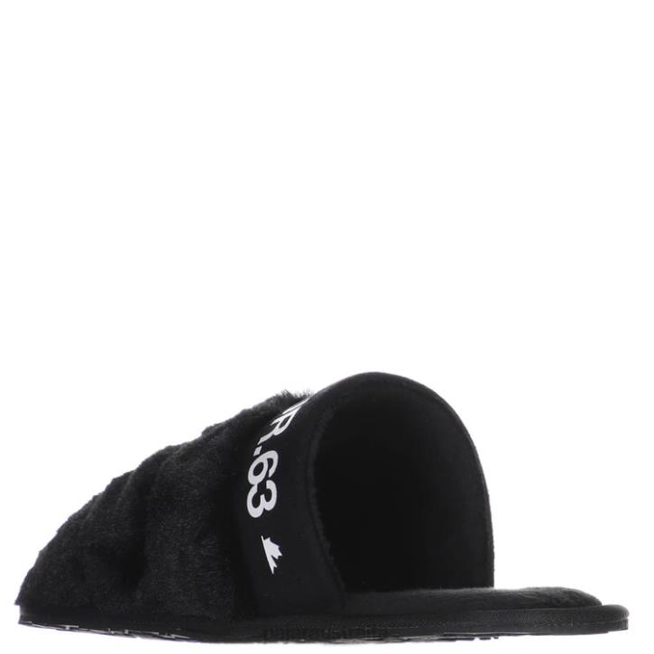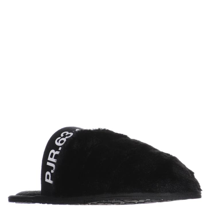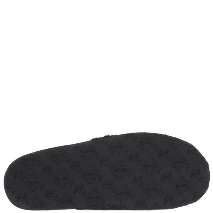Vegan Shearling slides with faux fur lining and logo band at vamp in elastic micro suede. Features signature maple leaf rubber sole plate from Pajar Canada for all day indoor / outdoor comfort. *
